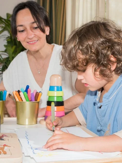 Psicóloga infantil trabajando con un niño en sesión de terapia infantil en consulta en Madrid